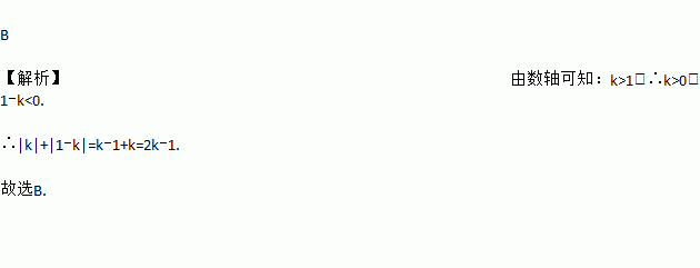 B 【解析】由数轴可知:k>1,∴k>0,1?k<0. ∴|k|+|1?k|=k?1+k=2k?1. 故选B.