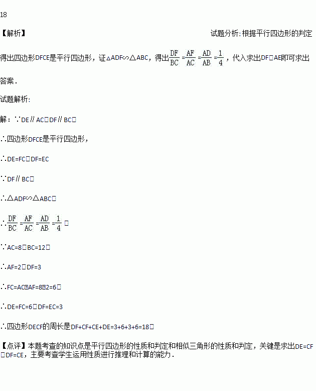 如图,在△ABC中,点D是边AB的四等分点,DE∥AC,DF∥BC,AC=8,BC=12,求四边形DECF的周长.