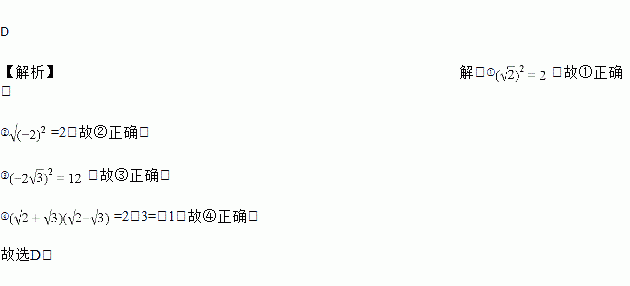 (2017·滨州中考)下列计算:①()2=2;②=2;③(-2)2=12;④(+)(-)=-1.其中结果正确的个数为( )