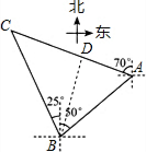 解:由题意得,∠ABC=25°+50°=75°,∠BAC=180°-70°-50°=60°,