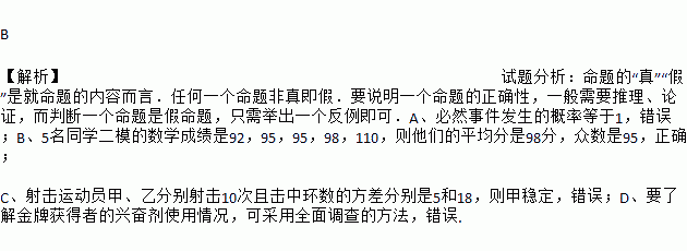 B. 5名同学的数学成绩是92,95,95,98,110,则他们的平均分是98,众数是95