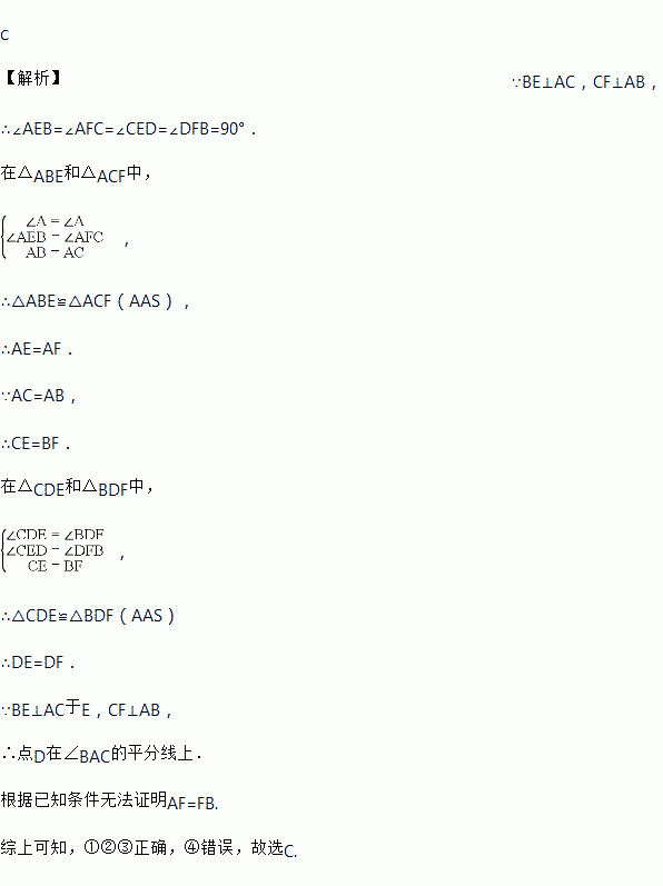 ①△ABE≌△ACF;②△BDF≌△CDE;③点D在∠BAC的平分线上;④点C在AB的中垂线上.