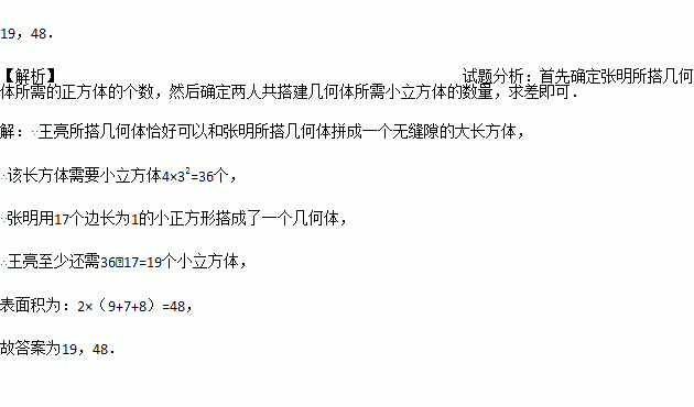 如图,在一次数学活动课上,张明用17个边长为1的小正方形搭成了一个几何体,然后他请王亮用其他同样的小正方体在旁边再搭一个几何体,使王亮所搭几何体恰好可以和张明所搭几何体拼成一个无缝隙的大长方体(不改变张明所搭几何体的形状),那么王亮至少还需要 个小立方体,王亮所搭几何体的表面积为 .