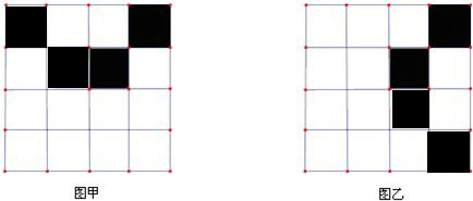 分析:根据轴对称图形的性质得出,分别在图甲、图乙中再将两个空白的小正方形涂黑,使它成为轴对称图形即可.