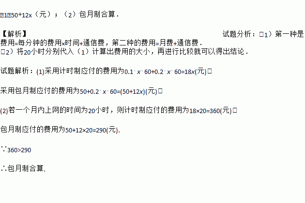(2)如果某用户一个月内上网的时间为20小时,你认为采用哪种方式较为合算?