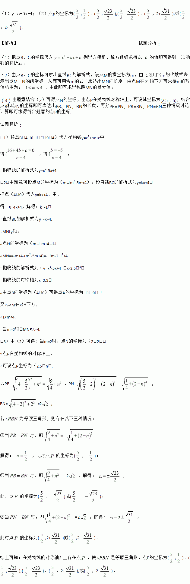 (2)若点M是抛物线在x轴下方的动点,过点M作MN∥y轴交直线BC于点N求线段MN的最大值;(3)在(2)的条件下,当MN取得最大值时,在抛物线的对称轴l上是否存在点P使△PBN是等腰三角形?若存在,请直接写出所有点P的坐标;若不存在,请说明理由.