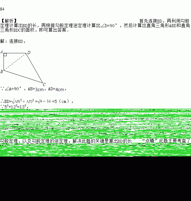 已知,如图,四边形ABCD中,AB=3cm,AD=4cm,BC=13cm,CD=12cm,且∠A=90°,求四边形ABCD的面积.