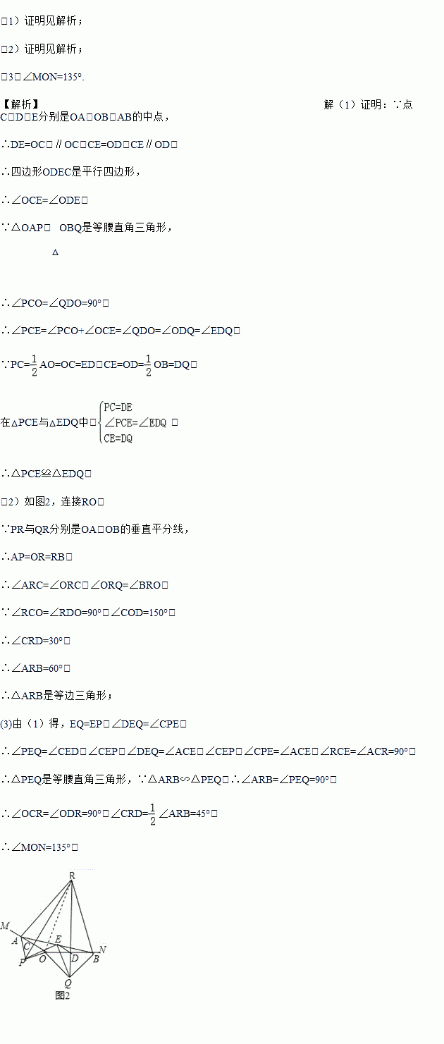 如图1,A,B分别在射线OA,ON上,且∠MON为钝角,现以线段OA,OB为斜边向∠MON的外侧作等腰直角三角形,分别是△OAP,△OBQ,点C,D,E分别是OA,OB,AB的中点.