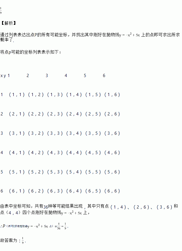 现有A,B两枚均匀的骰子(骰子的每个面上分别标有数字1,2,3,4,5,6).以小莉掷出A骰子正面朝上的数字为x、小明掷出B骰子正面朝上的数字为y来确定点P(x,y),那么它们各掷一次所确定的点P在已知抛物线y=-x2+5x上的概率为__.