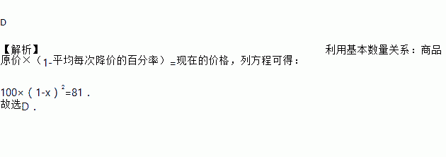 某商品经过连续两次降价,销售单价由原来100元降到81元设平均每次降价的百分率为x,根据题意可列方程为