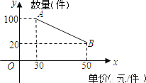 销售某种商品,根据经验,销售单价不少于30元件,但不超过50元件时,销售数量件与商品单价元件的函数关系的图象如图所示中的线段AB.