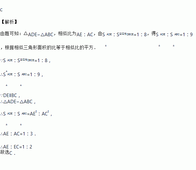 如图所示,已知D、E分别是△ABC的边AB,AC上的点且DE∥BC,若S△ADE:S四边形DBCE=1:8,那么AE:EC等于( )