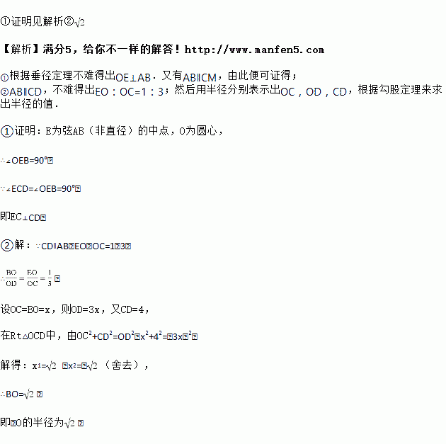 ②当EO:OC=1:3,CD=4时,求⊙O的半径.