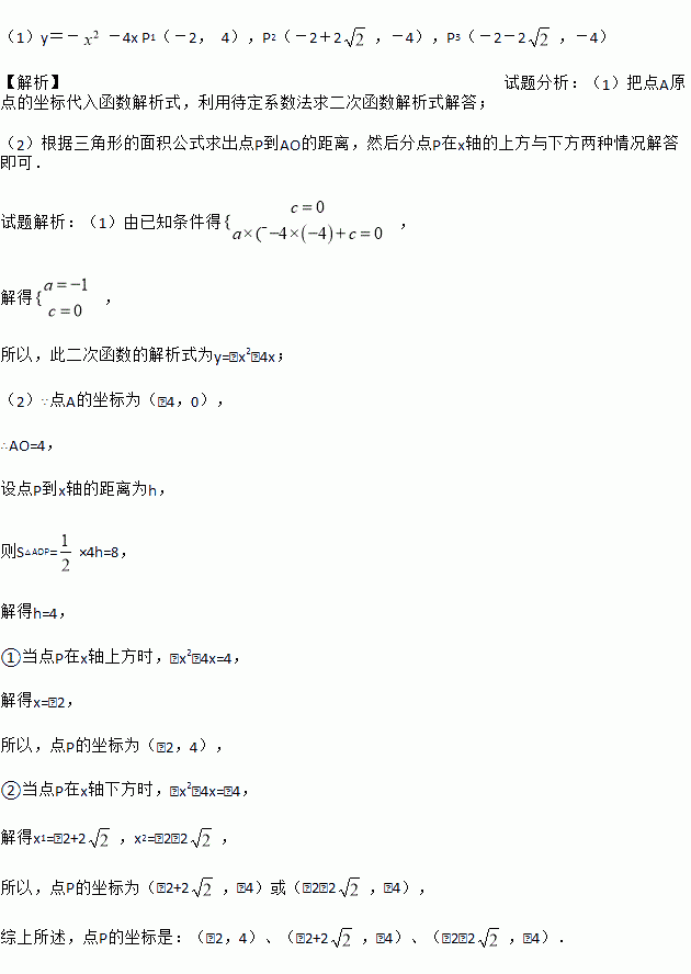 (1)y=--4x P1(-2, 4),P2(-2+2,-4),P3(-2-2,-4) 【解析】试题分析:(1)把点A原点的坐标代入函数解析式,利用待定系数法求二次函数解析式解答; (2)根据三角形的面积公式求出点P到AO的距离,然后分点P在x轴的上方与下方两种情况解答即可. 试题解析:(1)由已知条件得, 解得, 所以,此二次函数的解析式为y=﹣x2﹣4x; ...