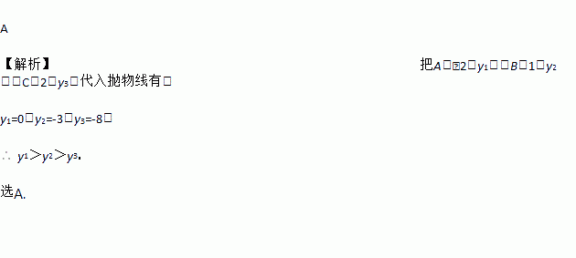 A 【解析】把A(﹣2,y1),B(1,y2),C(2,y3)代入抛物线有, y1=0,y2=-3,y3=-8, y1>y2>y3。 选A.