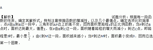 如图,矩形ABCD中,AB=1,AD=2,M是CD的中点,点P在矩形的边上沿A→B→C→M运动,则△APM的面积y与点P经过的路程x之间的函数关系用图象表示大致是下图中的( )