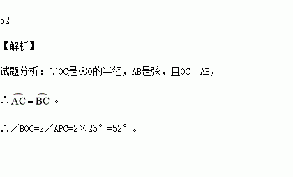 如图,OC是⊙O的半径,AB是弦,且OC⊥AB,点P在⊙O上,∠APC=26°,则∠BOC= 度.