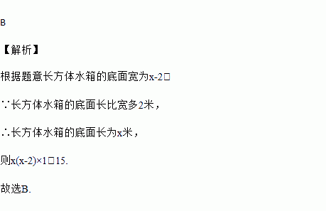 将一块矩形铁皮的四个角各剪去一个边长为1米的正方形后,剩下的部分刚好围成一个容积为15m3的无盖长方体水箱,且此长方体水箱的底面长比宽多2米.求该矩形铁皮的长和宽各是多少米?若设该矩形铁皮的宽是x米,则根据题意可得方程为( )