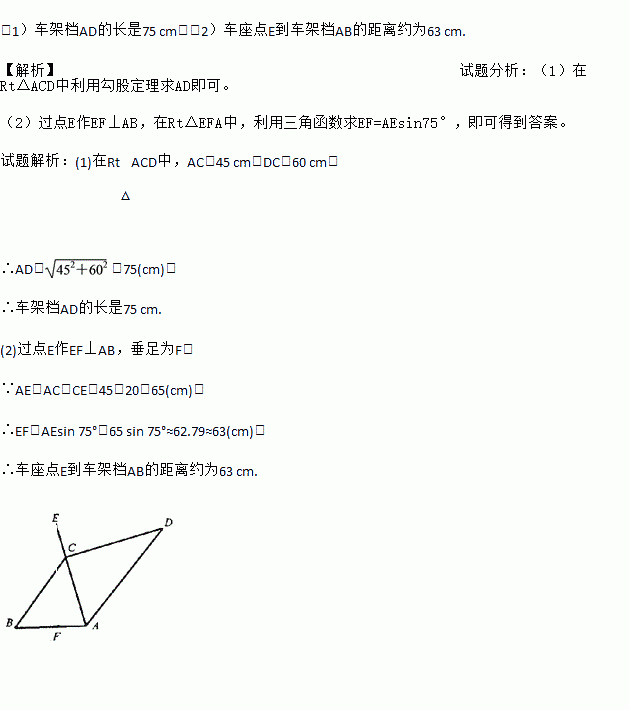 (2)求车座点E到车架档AB的距离(结果精确到1 cm).