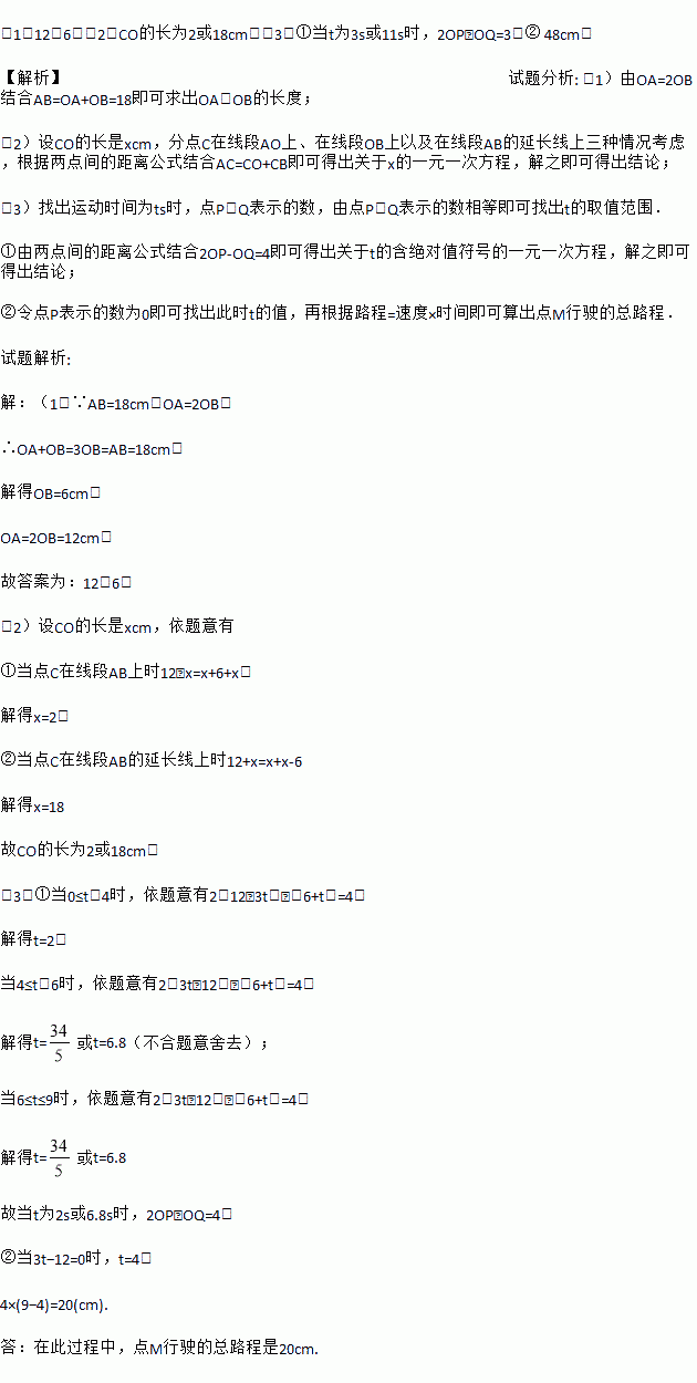 (1)12,6;(2)CO的长为2或18cm;(3)①当t为3s或11s时,2OP﹣OQ=3;② 48cm. 【解析】试题分析: (1)由OA=2OB结合AB=OA+OB=18即可求出OA、OB的长度; (2)设CO的长是xcm,分点C在线段AO上、在线段OB上以及在线段AB的延长线上三种情况考虑,根据两点间的距离公式结合AC=CO+CB即可得出关于x的一元一次方程,解之即可得出结论;...