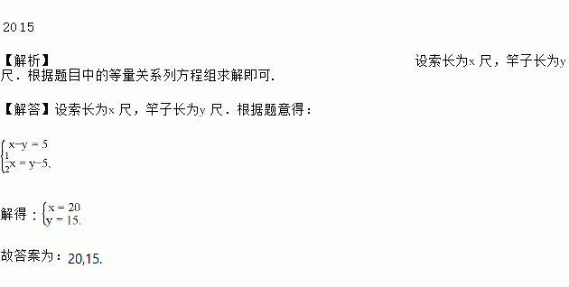 我国明代数学读本《算法统宗》一书中有这样一道题:一支竿子一条索,索比竿子长一托,对折索子来量竿,却比竿子短一托.如果1托为5尺,那么索长为__________尺,竿子长为__________尺.