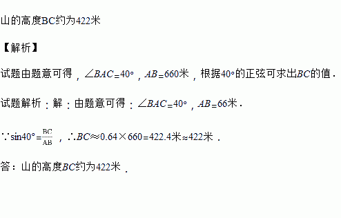 如图,某游客在山脚下乘览车上山.导游告知,索道与水平线成角∠BAC为40°,览车速度为60米/分,11分钟到达山顶,请根据以上信息计算山的高度BC.(精确到1米)(参考数据:sin40°=0.64,cos40°=0.77,tan40°=0.84)