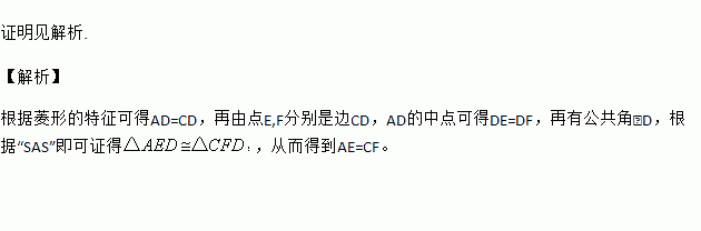 如图,已知四边形ABCD是菱形,点E,F分别是边CD,AD的中点.求证:AE=CF.