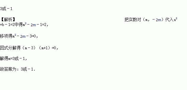 刘谦的魔术表演风靡全国,小明也学起了刘谦发明了一个魔术盒,当任意实数对(a,b)进入其中时,会得到一个新的实数:a2+b﹣1,例如把(3,﹣2)放入其中,就会得到32+(﹣2)﹣1=6.现将实数对(m,﹣2m)放入其中,得到实数2,则m=______.