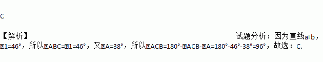 如图,直线a∥b,∠A=38°,∠1=46°,则∠ACB的度数是( )