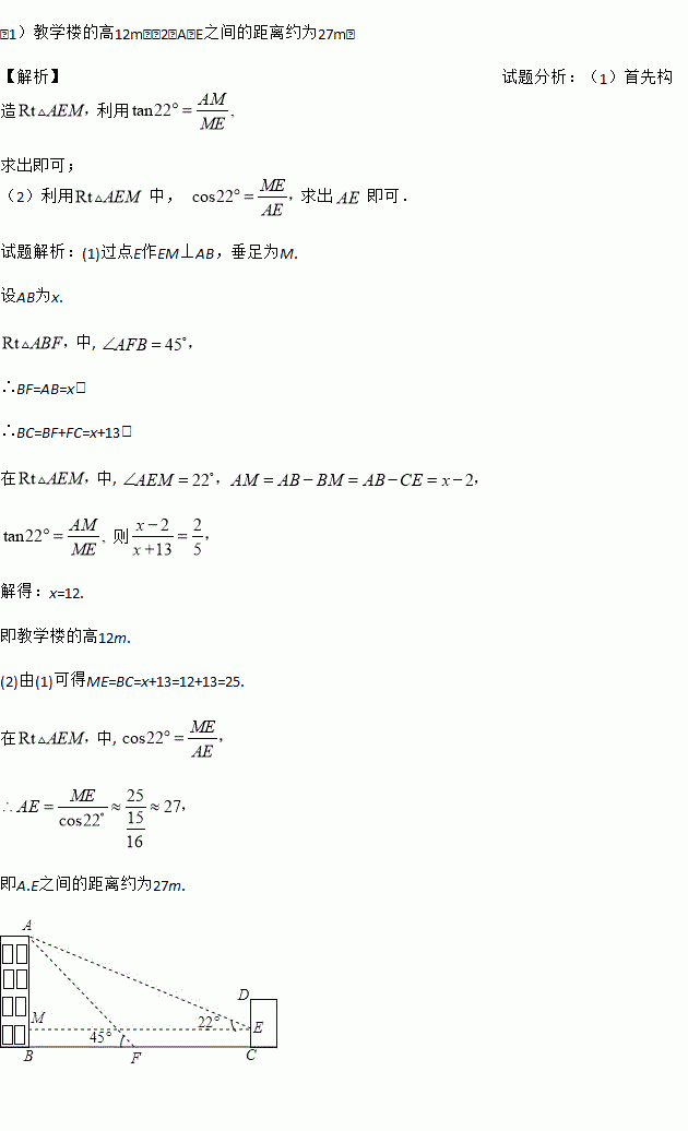如图,某校教学楼AB的后面有一建筑物CD,当光线与地面的夹角是22°时,教学楼在建筑物的墙上留下高2米的影子CE;而当光线与地面夹角是45°时,教学楼顶A在地面上的影子F与墙角C有13米的距离(B、F、C在一条直线上)