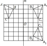 (1)如图所示,①作出△ABC关于直线m的对称图形△A1B1C1;②作出△ABC关于点O对称的图形△A2B2C2;