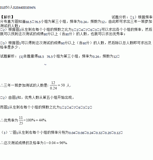 在一次环保知识测试中,三年一班的两名同学根据班级成绩(分数为整数)分别绘制了不同的频率分布直方图,如图1、2,已知图1从左到右每个小组的频率分别为0.04、0.08、0.24、0.32、0.20、0.12,其中68.5~76.5小组的频数为12;图2从左到右每个小组的频数之比为1:2:4:7:6:3:2,请结合条件和频率分布直方图回答下列问题: