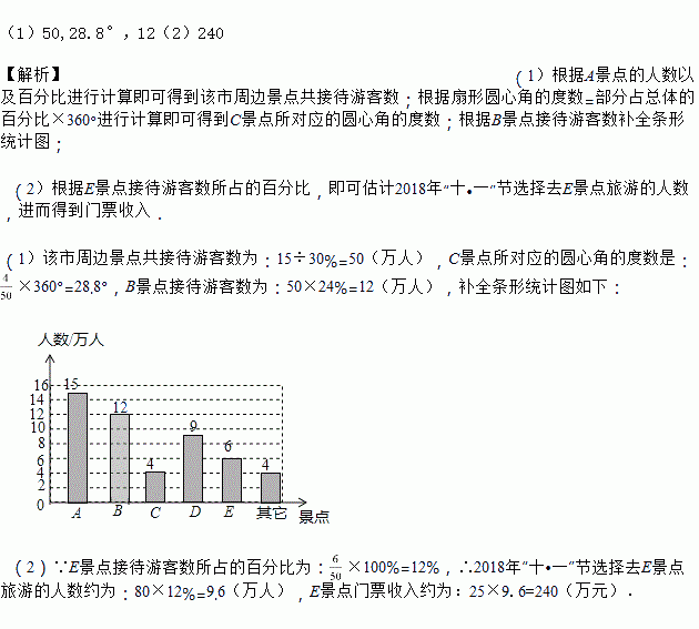 (2)根据近几年到该市旅游人数增长趋势,预计2018年“十·一”国庆节将有80万游客选择该市旅游,E景点每张门票是25元,请估计2018年“十·一”国庆期间E景点门票收入约是多少万元?