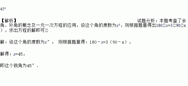 45° 【解析】试题分析:本题考查了余角、补角的概念及一元一次方程的应用,设这个角的度数为x°,则根据题意得出180﹣x=3(90﹣x),求出方程的解即可. 【解析】 设这个角的度数为x°, 则根据题意得:180﹣x=3(90﹣x), 解得:x=45, 即这个锐角为45°.