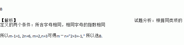 B 【解析】试题分析:根据同类项的定义的两个条件:所含字母相同,相同字母的指数相同 所以m-1=1, 2n=6, m=2,n=3可得m-n="2=3=-1," 所以选B.