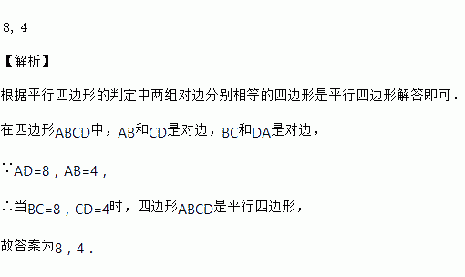 若AD=8,AB=4,那么当BC=(____),CD=(____)时,四边形ABCD是平行四边形.
