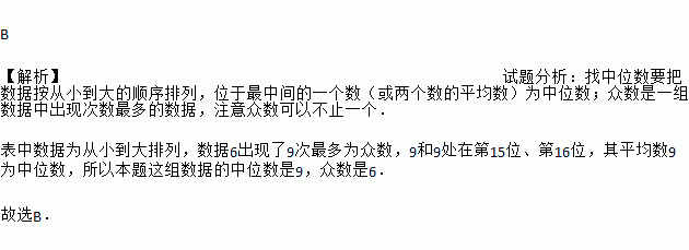 B 【解析】试题分析:找中位数要把数据按从小到大的顺序排列,位于最中间的一个数(或两个数的平均数)为中位数;众数是一组数据中出现次数最多的数据,注意众数可以不止一个. 表中数据为从小到大排列,数据6出现了9次最多为众数,9和9处在第15位、第16位,其平均数9为中位数,所以本题这组数据的中位数是9,众数是6. 故选B.