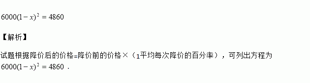 某种型号的电脑,原售价6000元/台,经连续两次降价后,现售价为4860元/台,设平均每次降价的百分率为,则根据题意可列出方程: .