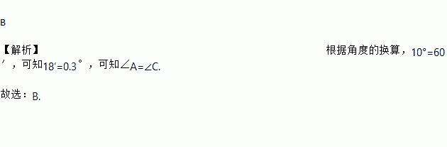 B 【解析】根据角度的换算,10°=60′,可知18′=0.3°,可知∠A=∠C. 故选:B.