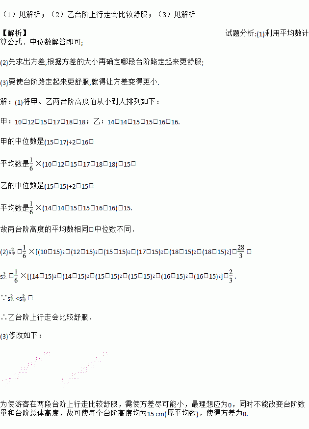 (1)把每一级台阶的高度作为数据,请从统计知识方面(平均数、中位数)说一下甲、乙两段台阶有哪些相同点和不同点?