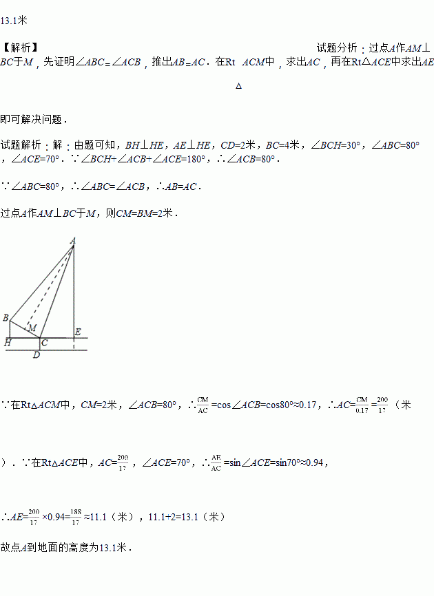 如图①,②分别是某吊车在吊一物品时的实物图与示意图,已知吊车底盘CD的高度为2米,支架BC的长为4米,且与地面成30°角. 吊绳AB与支架BC的夹角为80°,吊臂AC与地面成70°角,求吊车的吊臂顶端A距地面的高度是多少米?(精确到0.1米. 参考数据:sin10°=cos80°≈0.17,cos10°=sin80°≈0.98,sin20°=cos70°≈0.34,tan70°≈2.75,sin70°≈0.94)