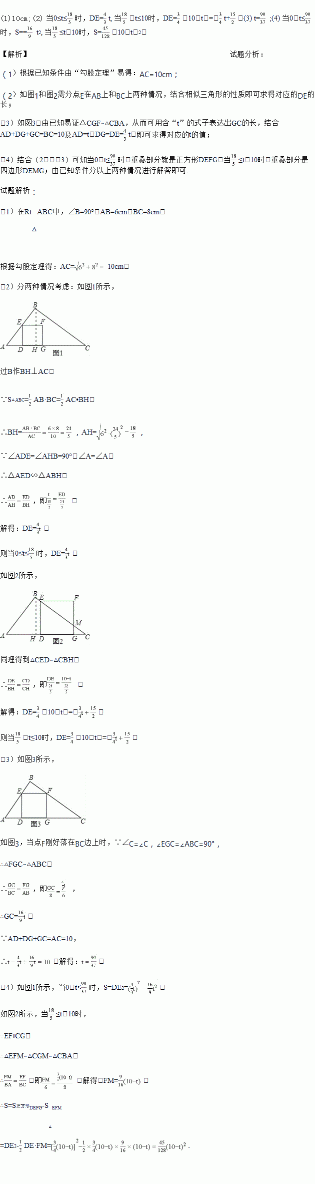 如图,在Rt△ABC中,∠B=90°,AB=6cm,BC=8cm,点D从点A出发以1cm/s的速度运动到点C停止.作DE⊥AC交边AB或BC于点E,以DE为边向右作正方形DEFG.设点D的运动时间为t(s).