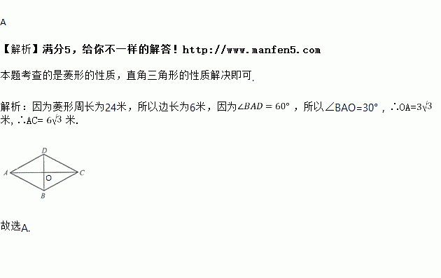 如图,已知某广场菱形花坛ABCD的周长是24米,∠BAD=60°,则花坛对角线AC的长等于( )