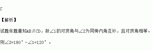 如图,AB∥CD,若∠1=600,则∠2等于 ( )