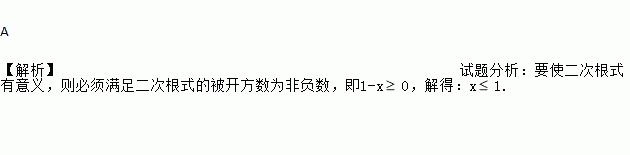 A 【解析】试题分析:要使二次根式有意义,则必须满足二次根式的被开方数为非负数,即1-x0,解得:x1.