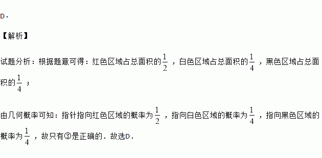 D. 【解析】 试题分析:根据题意可得:红色区域占总面积的,白色区域占总面积的,黑色区域占总面积的; 由几何概率可知:指针指向红色区域的概率为,指向白色区域的概率为,指向黑色区域的概率为,故只有③是正确的.故选D.