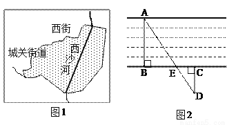如图1,西沙河属马刨泉河支流,发源于房山区城关街道迎风坡村,流域面积11平方公里,为估算西沙河某段的宽度,如图2,在河岸边选定一个目标点A,在对岸取点B,C,D。使得AB⊥BC,CD⊥BC,点E在BC上,并且点A,E,D在同一条直线上,若测得BE=2m,EC=1m,CD=3m,则河的宽度AB等于_____m.