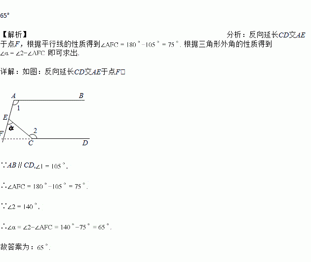 如图, l1∥l2,∠1 = 105°,∠2 = 140°,则∠α = _____________.