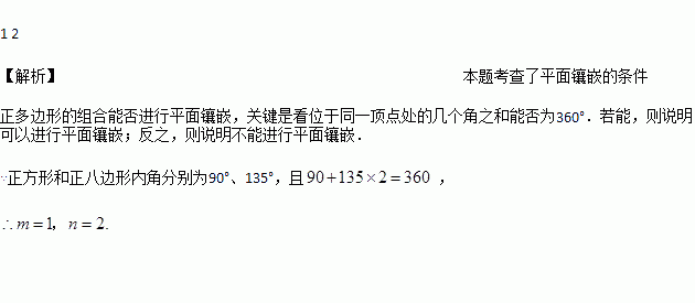 用正多边形镶嵌,设在一个顶点周围有m个正方形、n个正八边形,则m=_____,n=______.
