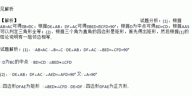 如图:已知在△ABC中,AB=AC,D为BC边的中点,过点D作DE⊥AB,DF⊥AC,,垂足分别为E,F.